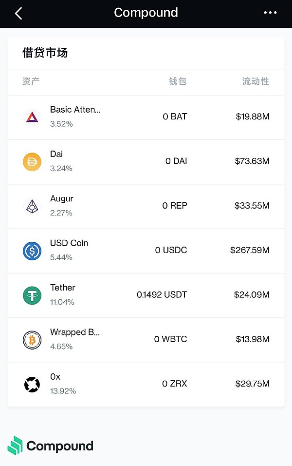 目前 Compound 支持的幣種有:BAT、DAI、ETH、REP、USDC、USDT、WBTC 和 ZRX 這8種,也就是說我們可以通過把這些幣存儲到 Compound 來進行 COMP 代幣的挖礦操作。