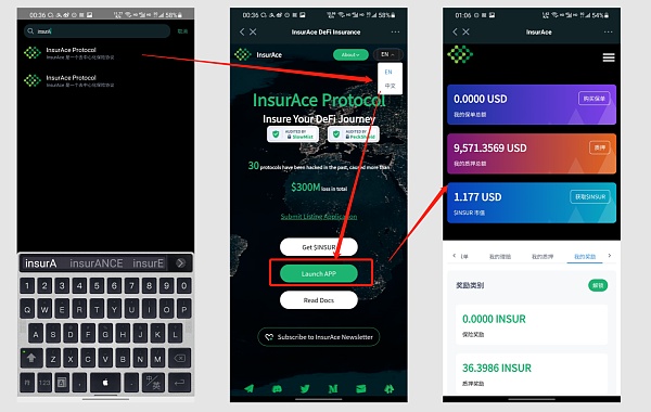 將Coinhub錢包切換至BSC公鏈,在發現頁頂部直接搜索“InsurAce”, 進入項目官網,通過右上角語言欄位切換為中文,后點擊頁面中部 「Launch APP/進入APP」按鈕進入DAPP