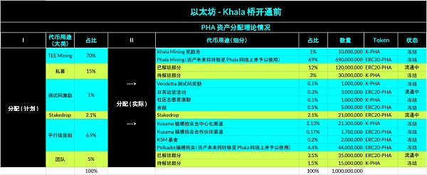 根據初版《Phala經濟白皮書》中的“代幣分配”以及此前在 Khala 卡槽競拍策略中公布的 Khala Network 經濟模型部分內容,不難得出以太坊 - Khala 橋開通前 PHA 資產分配的理論情況如下: