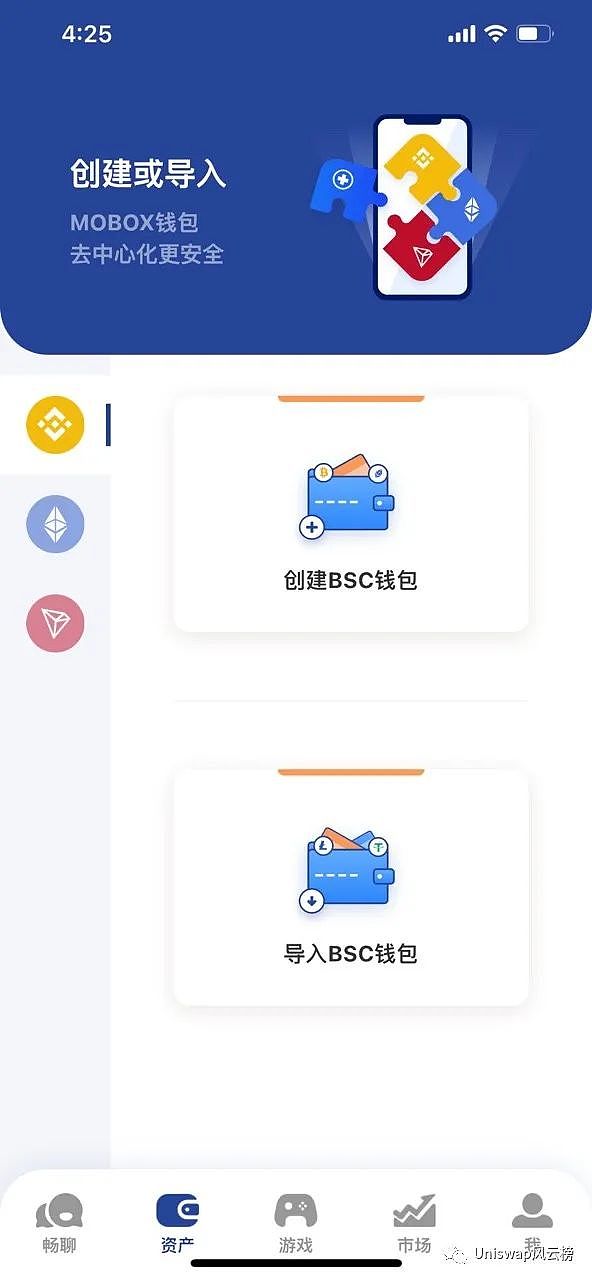第一步:打開 MOBOX DAPP,切換到 “資產” 頁面,然后點擊 “創建BSC錢包”。