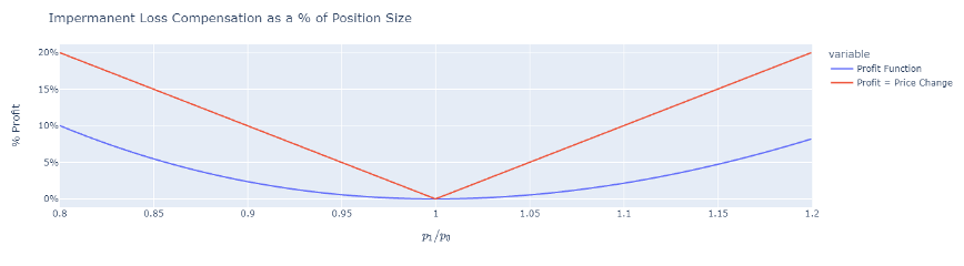 其中p_0是你拿到合約時的交換價格,p_1則是現在的價格,因此利潤是價格變化的函數,可以將你的頭寸價值與無常損失聯系起來。