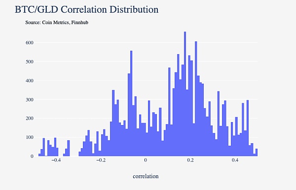 下圖顯示了過去一年中比特幣和黃金之間的日內相關性分布(5分鐘收益,60小時滾動相關性)。它也相對集中地分布在0附近,但平均值為0.1194,略高于比特幣與S&P 500相關性分布的平均值。