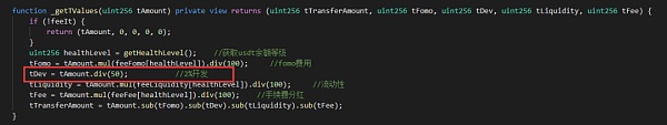 由于 DINA 是 safemoon 的升級版,這里僅對新功能板塊進行代碼分析:浮動費率、Fomo獎金池、手動銷毀和防止砸盤。