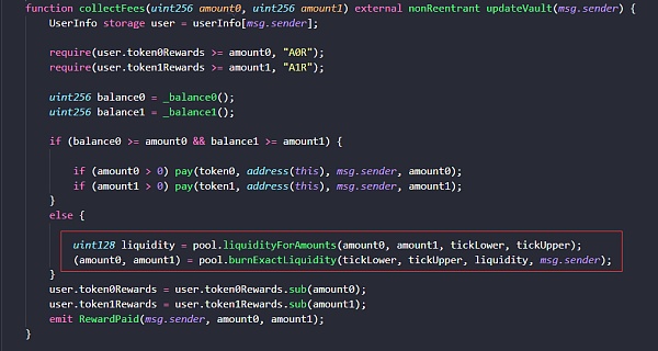 這時因為滿足此處條件,所以會到pool地址(UNIV3的對應交易對地址)去移除流動性,并將代幣發送給合約B、C。