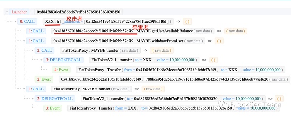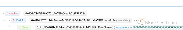 這里的問題就變成為什么攻擊者能具有相應的權限?通過進一步分析我們發現另外一筆交易。這一筆交易將攻擊者賦予具有轉賬的權限。交易trace如下: