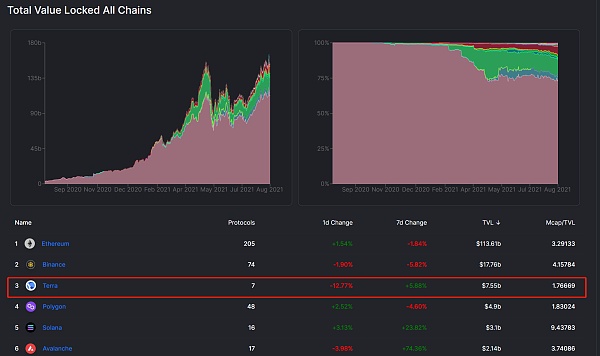 隨著2021年市場新公鏈的不斷崛起,Terra也在今年7月份推出 1.5 億美金的生態基金,用于扶植 Terra 生態內的應用,提升 Terra DeFi 生態的可訪問性,為更多主流場景所采用,進一步提升的其生態的整體價值,前文提到的Columbus-5 更新中包含的跨鏈也能看出Terra擴充生態的目標。