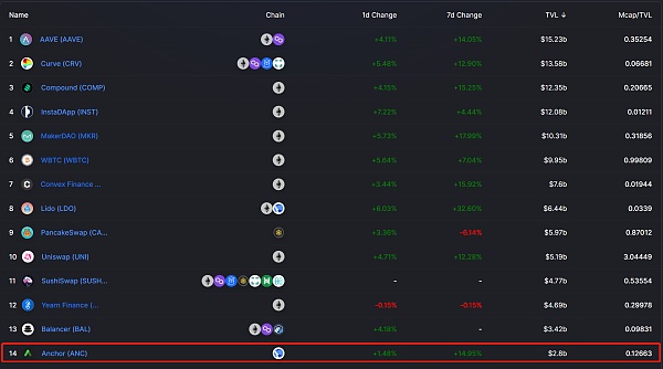 20%的APR看似一般,但在借貸協議賽道橫向對比,20%的固定儲值利率已具備足夠的競爭力,通過上圖的數據我們也能看到,Anchor的利率幾乎一直穩定在19%以上,這也是Anchor最核心的增長手段,20%的利率足夠吸引資金大戶入駐。目前Anchor的TVL為28億美金,位于DeFi協議TVL榜單位居第14位。