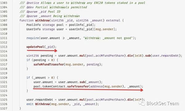 下圖是MemeStake的withdraw函數。該函數首先會檢查user.amount是否還有足夠的余額,但由于user.amount本身比真實值大,因此這里的檢查是不準確的。接下來,同樣會調用updatePool函數更新資金池狀態。