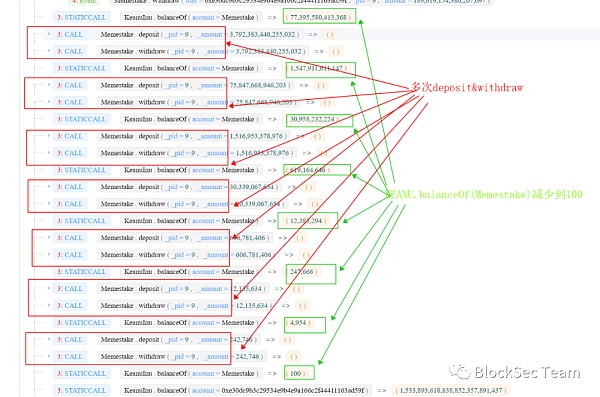 第2步(操縱),攻擊者先從uniswapV2中flash loan大量的KEANU代幣,然后通過合約二往Memestake中多次deposit 和withdraw大量KEANU,導致Memestake被迫大量交易KEANU。由于KEANU是一種通縮代幣,每次交易會燒掉2%的交易額,導致用戶真正存入Memestake的量比登記的user.amount更小,取出時又是按照user.amount轉給用戶(詳見代碼分析),導致Memestake池子中KEANU的代幣持有量不斷減少,最終為1e-07。如下圖所示,涉及交易為0x00ed,交易截圖未完全,請自行根據交易查看。