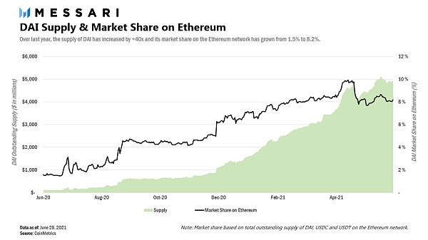 2020 年 5 月,在 MCD 啟動 7 個月后,DAI 的總供應量達到了 1 億美元。一年多以后,也就是 2021 年 6 月,DAI 的總供應現已超過 50 億美元。