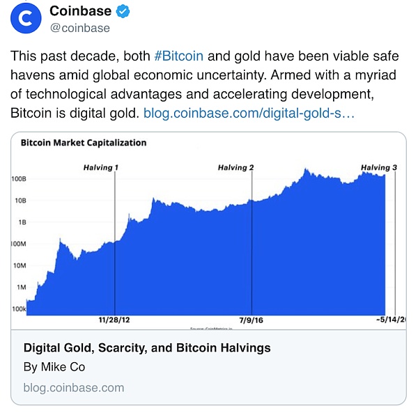 在今年一月份,Coinbase上的比特幣價格上漲了約30%時,Coinbase開始宣揚區塊獎勵減半將導致比特幣價格上漲。除了稀缺性以外,Coinbase還總結了比特幣的一些其它重要屬性,簡而言之,Coinbase更喜歡比特幣而不是黃金: