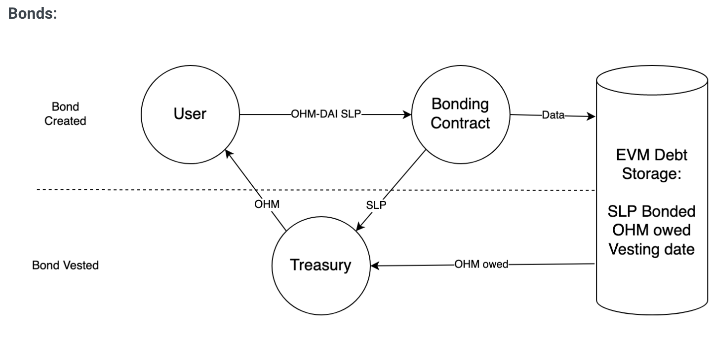 為了激勵 OHM 的流動性提供者,OlympusDAO 引入了債券,向流動性提供者提供了在將來以折扣價購買 OHM 的選擇權。協議會引用一定數量的 OHM 及歸屬期,到期之后,如果用戶接受報價,可以選擇以折扣價將其 OHM/ETH 的 LP Token 交換成 OHM。雖然此時協議鑄造了額外的 OHM,但也從 LP Token 中獲得了更多的 DAI 作為儲備。