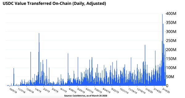 此外,一種新的金融服務類別被稱為 "DeFi",即去中心化金融已經被創建,從而使穩定幣可以被程序化地借入、借出和作為抵押品使用。智能合約借貸協議,如Compound、dYdX、Nuo和Aave等智能合約借貸協議,目前USDC的年利率區間為0.44-2.36%(截至4月1日),歷史上的年利率更高。