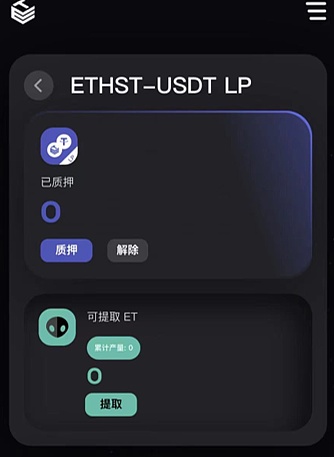 例如,在ETHST-USDT LP礦池中,您可以選擇鎖倉質押ETHST-USDT LP token來挖礦獲得ET代幣,具體質押操作參考上方 ETHST礦池挖礦教程