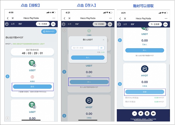 XRP/HKD-2.2%Heco PayYoda是PayYoda生態在DeFi板塊的重要聚合器,通過其在DeFi板塊的治理代幣HYOT,為DeFi投資者提供最完整的生態聚合服務,為不熟悉技術操作或希望以更少投入方式進行交易互動的用戶,簡化不斷復雜的DeFi生態世界。隨著HYOT上線,將帶來新一輪DeFi浪潮。為了方便投資者及時了解HYOT的相關信息和挖礦流程,現推出以下HYOT挖礦教程。