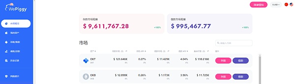 用戶可通過 PC 端和 H5 端使用 WePiggy 借貸協議,并測試存款和借款挖礦功能,測試幣種包括 OKT、OKB、USDT、USDK、USDC、BTCK、ETHK、DOTK、LTCK 和 FILK。按要求在 OEC 上進行過存款和借款操作的用戶,即有機會獲得 OKT 空投。