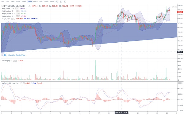 ETH:ETH 目前處于利好頻發狀態,以太坊 2.0 即將上線,國家區塊鏈平臺可支持的公鏈框架。ETH 目前可以做多為主,止損點設在 $163。在 4 月 20 日 ETH 最低下跌至 $165,目前 ETH 價格已突破 $190。