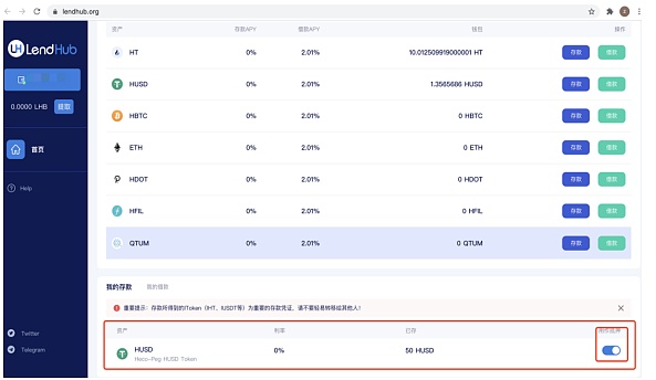 登陸LendHub(域名鏈接:www.Lendhub.org)選擇“Heco主網”→鏈接錢包,選擇“對應資產”進行“存款”