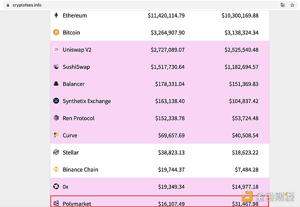 根據 Crypto Fees 數據,Polymarket 近 7 日平均每天扣除 3.1 萬美元手續費,在所有區塊鏈項目中排名第 12。