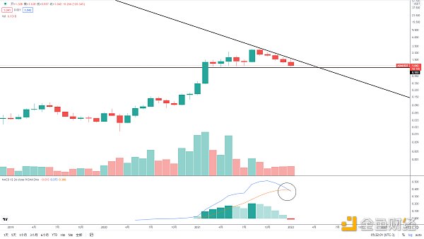 ADA跟隨大盤沖高回落,下方標準平衡線在0.9-0.92區間,回踩不破可以考慮適量低吸,月線五連陰并且剛死叉,后面同樣有反彈修復需求,有可能將再次測試上方三角壓制線。