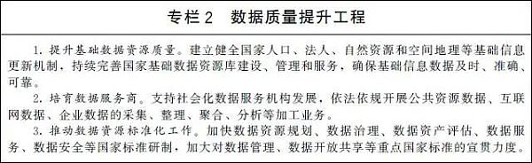 (一)強化高質量數據要素供給。支持市場主體依法合規開展數據采集,聚焦數據的標注、清洗、脫敏、脫密、聚合、分析等環節,提升數據資源處理能力,培育壯大數據服務產業。推動數據資源標準體系建設,提升數據管理水平和數據質量,探索面向業務應用的共享、交換、協作和開放。加快推動各領域通信協議兼容統一,打破技術和協議壁壘,努力實現互通互操作,形成完整貫通的數據鏈。推動數據分類分級管理,強化數據安全風險評估、監測預警和應急處置。深化政務數據跨層級、跨地域、跨部門有序共享。建立健全國家公共數據資源體系,統籌公共數據資源開發利用,推動基礎公共數據安全有序開放,構建統一的國家公共數據開放平臺和開發利用端口,提升公共數據開放水平,釋放數據紅利。