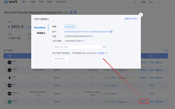 進入Nerve網頁錢包(https://wallet.nerve.network/),選擇已添加的USDT資產——跨鏈轉入。