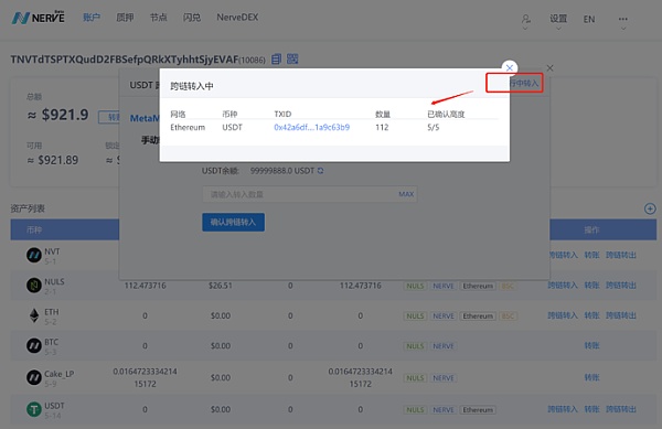 USDT資產成功跨鏈轉入Nerve網絡: