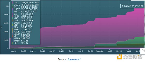 閃電貸基本上是一系列有順序的數據庫條目,當所有條目都在同一批交易(一個區塊)中處理時才會執行。Aave是閃電貸的最初發起者之一(dydx也是),為借款人提供短暫流動性,收取9個基點的發起費用。Aave在2020年前六個月發放了2500萬美元的貸款,在第三季度發放了5億美元。他們在10月和11月又發放了5億美元貸款。對于上線第一年的功能來說,情況還不錯。