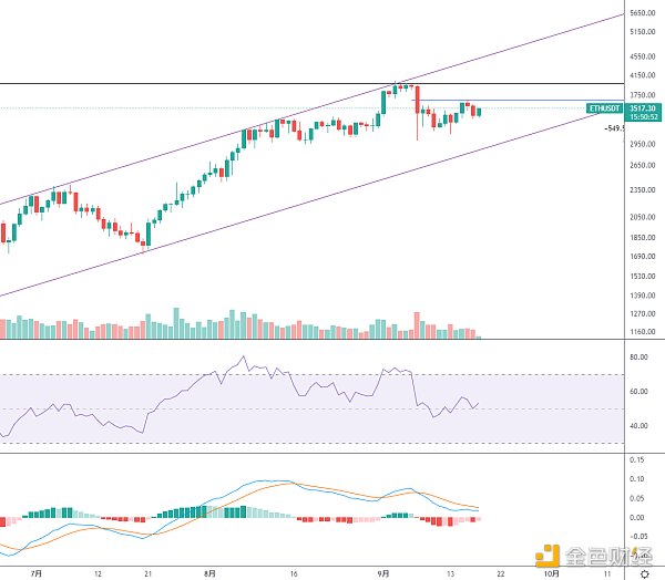前期提示的反彈壓力3650-3700區間依舊未能突破,和BTC一樣,9月13日3100啟動的這波反彈在未有效突破前,目前只能看作超跌反彈,短線依舊逢高減倉,遲遲不破那么后面就有再次探底的可能,周線支撐3200美金,大方向多頭趨勢未變。