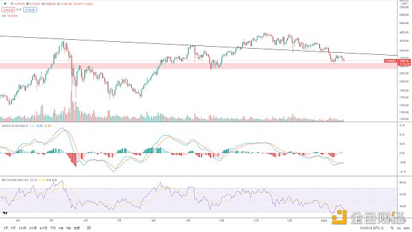 反彈后再次迎來探底,不過成交量萎縮,指標線上移,不放量跌破后面有機會形成雙底或者底背離,那么再次反彈的力度大概率要強于第一波,后面繼續關注2800-3000支撐,回落依舊可以考慮分批低吸。