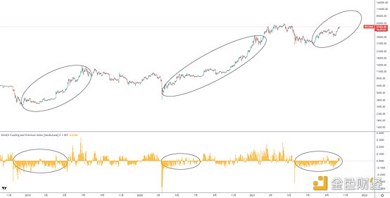 2018年熊市底部,BTC一直處于3000-4000美金區間震蕩筑底,相應的資金費率也是一直低位區間震蕩,經過18年底6000-3000美金的一波瀑布,市場情緒普遍悲觀,看空情緒高漲,情緒醞釀到極致,往往就會迎來行情拐點,后面一路漲至14000美金頂點再回落,而這一波行情拉升初期,價格在漲到8000美金前,資金費率還是處于低位,直至后面價格漲至頂部區域,資金費率才升至高位,這說明在上漲初期,價格越漲,市場恐高情緒嚴重,那么后續行情一般是繼續爆空拉升,直至到達市場狂熱階段。