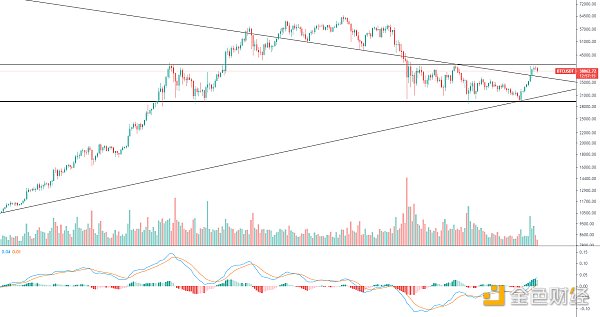 目前BTC已經突破前期文章提示的趨勢線,該線是前期斜頭肩頂的頸線支撐線,跌破迎來了519大跌,目前該線突破,近期結構斜雙底形態確立,那么上方壓力就是箱體上沿壓制41500美金一帶,這一帶突破,那么向上回升的速度就快了,不過目前日線已連漲多日,短線回踩下是正常現象,調整后有望繼續上攻。