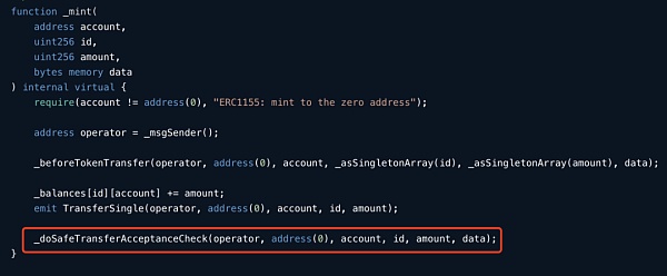該函數會調用攻擊合約的 onERC1155Received 函數,故此攻擊者利用攻擊合約中的重寫的 onERC1155Received 函數回調重入了 Revest 合約的 depositAdditionalToFNFT 函數