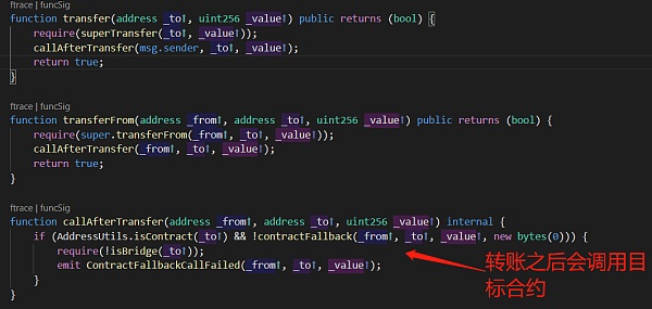 在 Hundred Finance 借貸協議的 borrowFresh 函數中,記賬是在代幣轉賬之后,但市場中 USDC、wBTC、wETH 使用的是 ERC677 類型 token 合約,它是 ERC20 合約的一個擴展,兼容 ERC20 協議標準。ERC677 在 token 進行轉賬之后,會回調到目標合約的 onTokenTransfer 方法,這就使攻擊者構造的惡意合約能進行重入攻擊。