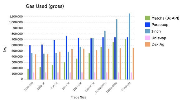 Uniswap 是 gas 使用量最低的交易所之一,因此這是所有聚合商都應該追求的目標,尤其是對于那些小型交易來說。一筆價值 100 美元的交易根本不可能分割到多個交易所上,即使 gas 價格只有 1 gwei 也是如此。