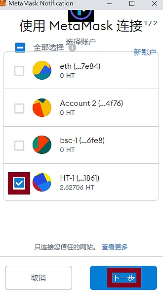 在 MetaMask 中選擇Heco錢包的賬戶,點擊 下一步Next,接著點擊 Connect連接 確認連接;