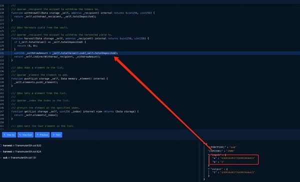 同樣是調用了 vault 的 harvest 函數,熟悉的配方,熟悉的味道。我們再次進行 debug,發現一個驚人的事實 —— 在進行收益的時候,vault 的 totalDeposit 竟然為 0,導致 4300 ETH 的收益直接分發給了 adapter,導致了 adapter 獲取的 totalValue 錯誤了,多了 4300 個 ETH,原因就是在這里。