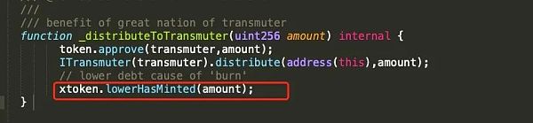 _distributeToTransmuter 函數的邏輯只有簡單的 3 行,我們主要關注的是最后的外部調用 —— lowerHashMinted 函數。該函數所對應的 xtoken 在這里指的是 alETH 本身。因為 alETH 本身是用戶通過借貸借出來的,所以 lowerHashMinted 這里的操作其實是使用 harvest 的收益將 alETH 總的貸出數量減少了,從而減少了每個用戶的貸款。總結來說就是用 harvest 4300 ETH 的收益償還用戶的 alETH 貸款。