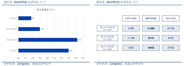 Axie Infinity的玩家月收入可達1600美元左右,相較于傳統工作已頗具吸引力。根據Coingecko發起的問卷調查(共1371個樣本),約60%的玩家通過手機體驗游戲,大部分玩家每日在該游戲上花費超過2個小時。玩家的游戲收入主要集中在151~200SLP每日,約合55美元每天,1665美元每月,而進入游戲購買初始資產所需要的資金門檻大概是690美元。