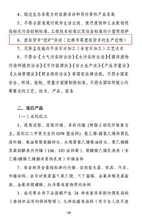 其中,虛擬貨幣“挖礦”活動(比特幣等虛擬貨幣的生產過程)位列第120頁。該條目后面未標淘汰期限和淘汰計劃。