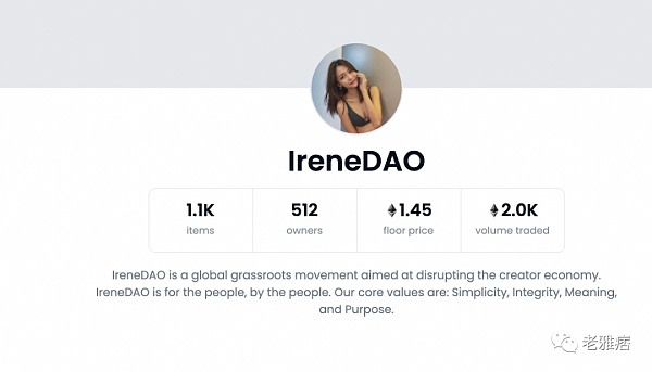 她以IreneDAO的名義,推出了一系列以個人照片為主題的NFT,價格從1/14日的0.2695ETH成交均價迅速上升到2.3ETH成交均價,地板價曾飆升至5ETH,目前底價為回落至1.7ETH。