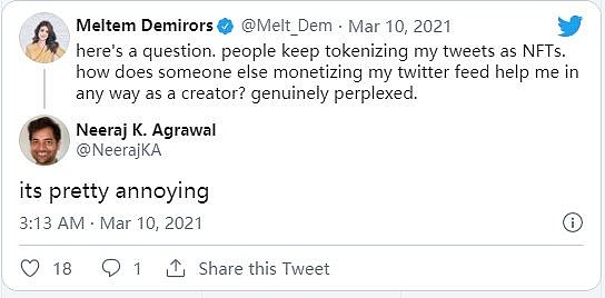 再舉個例子,在推特CEO在將其首推鑄造成NFT之后,市面上馬上就出現了其余名人的NFT推文。在未經其允許之下便將其推文鑄造為NFT,如果我們假設推特持有者可以再次鑄造這條推文,那么何者為真何者為假?