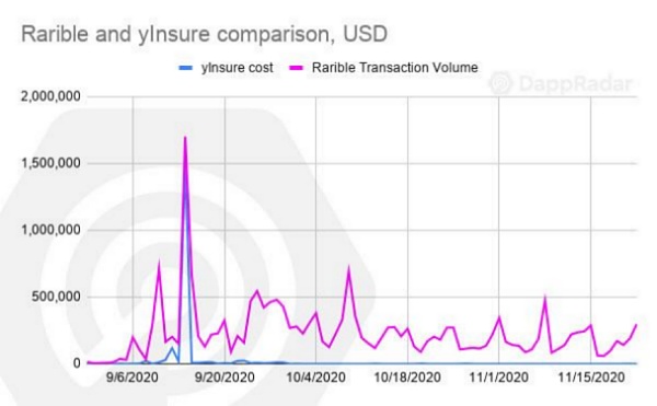 從保險產品的采用情況來看,最大高峰出現在平臺上線后的 9 月中旬,yInsure 內產生了 148 萬美元的費用。這個高峰主要由 RenVM 智能合約 365 天的長期保單引發,Rarible 的交易量也受到了這樣一個峰值的影響。?