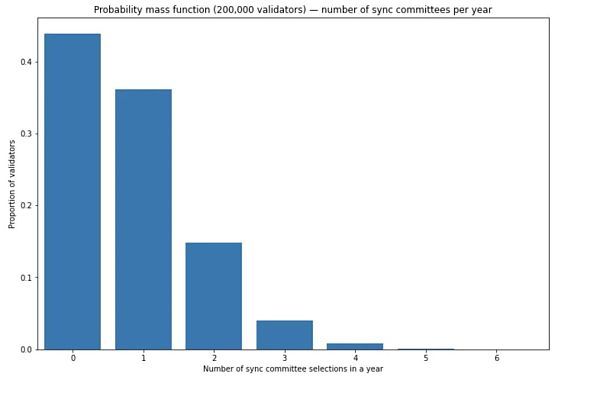 2、擁有200000個驗證器的驗證者集,平均每個驗證器每年將被分配到一個同步委員會0.82次;