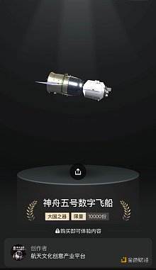 神舟五號是中國第一艘載人飛船,于2003年10月15日成功發射,此次發行的數字藝術收藏品是其首款文創商品,由航天文化創意產業平臺創作完成。該藏品依照原型最大限度實現高精度還原,是進行載人航天人文歷史科普的創新嘗試。據悉,團隊為購買成功的用戶埋下了一個小驚喜——在返回艙上刻下了神舟五號的名字。