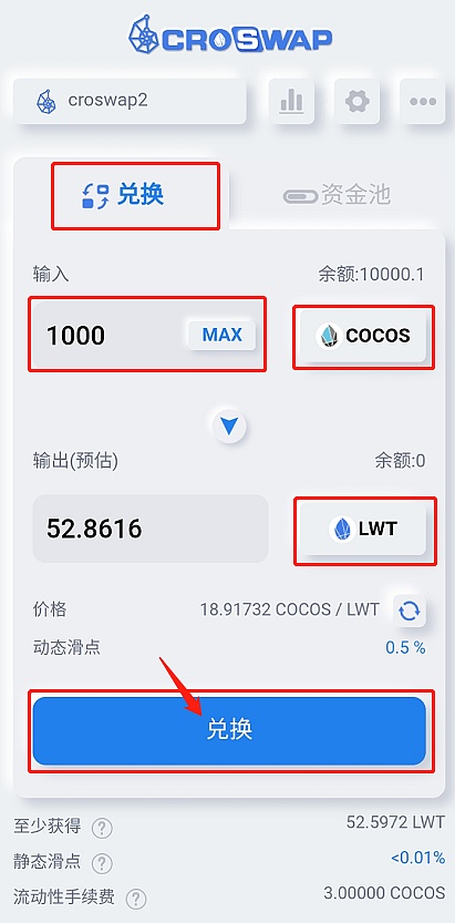 XRP/HKD-0.52%1、進入croswap.com,選中“兌換”界面,選擇與COCOS兌換交易的代幣名稱并輸入兌換值,然后點擊最下方“兌換”;