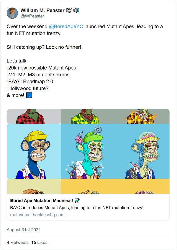 說到BAYC,該項目剛剛啟動了MAYC的擴展。請看我最近寫的Metaversal文章中提到的興奮點所在。