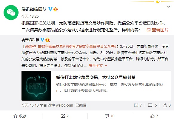 騰訊在封禁平臺后表示:在符合法律監管的同時各個需要涉及到區塊鏈信息服務備案、網絡出版服務許可、信息網絡傳播視聽節目許可、藝術品經營平臺備案、增值電信業務經營許可等合規資質牌照,并且將進行下一輪舉措,集中打擊類似"空投"在微信生態拉人頭裂變等行為;