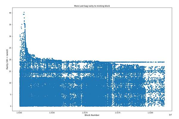 依據鑄造時間對 More Loot 中稀有物品的分布與原始 Loot 之間進行比較,可以發現,More Loot 中存在作弊的跡象變得非常明顯。 僅僅幾個區塊之后,所有稀有的 NFT 都已被鑄造出來,之后的鑄造者只能吃到殘羹剩飯,他們基本上不知道老練的用戶已經對這次 NFT 啟動動了手腳。
