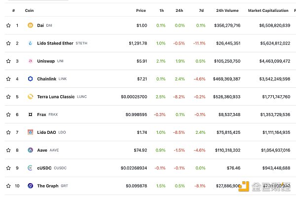 DeFi項目鎖定資產前十排名及鎖倉量 數據來源:defillama
